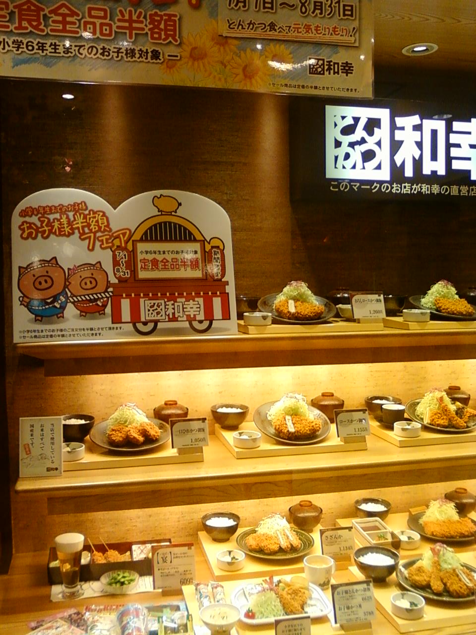 ここのとんかつ和幸さんは、小田急線町田駅西口から徒歩で3分くらいのところにある、東急イーストの8階シーズンダイニングのフロアにあります。ここのフロアはとても個性的で魅力的、国際性にあふれるレストランがそろっていて気に入っています。ここの和幸さんもほかの店舗にくらべて広くておしゃれで落ち着きます。子供用の特別格安料金設定をしていました。
