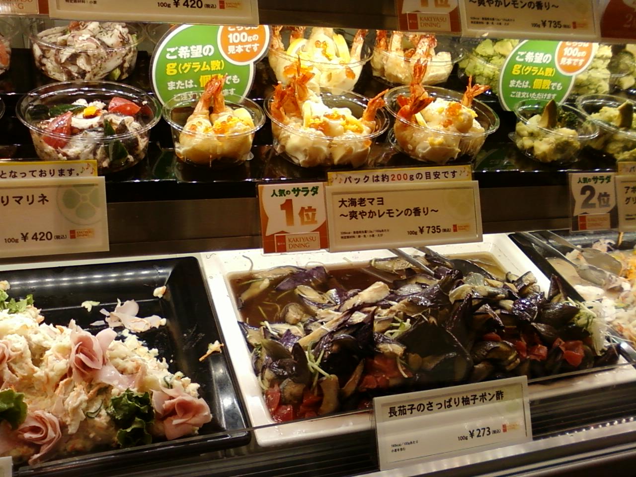 ここの柿安ダイニングさんは、、東京メトロ銀座駅からすぐのところにある、銀座三越の地下二階、ギンザフードガーデンの一角にあります。とにかく盛り付けが上手で、エビがきらきらと輝いていたり、サラダのハムが薔薇のようだったりとさすがです。お客さんの食欲を引き出す方法を心得ているお惣菜屋さんです。アボグリーンというサラダをいただきました。さっぱりした味付けで、夏にぴったりです。