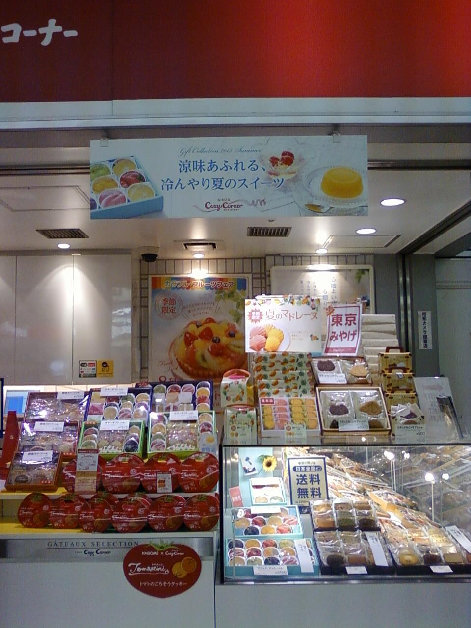 ここの銀座コージーコーナーさんは、新宿駅の構内、南口と東南口の間、南口の化粧室の右前あたりにあります。ホームへの階段のすぐ脇にあるので、ちょっとした手土産の調達に良いですね。最近はとまとのごちそうクッキーや季節限定の夏のマドレーヌなどを売っています。