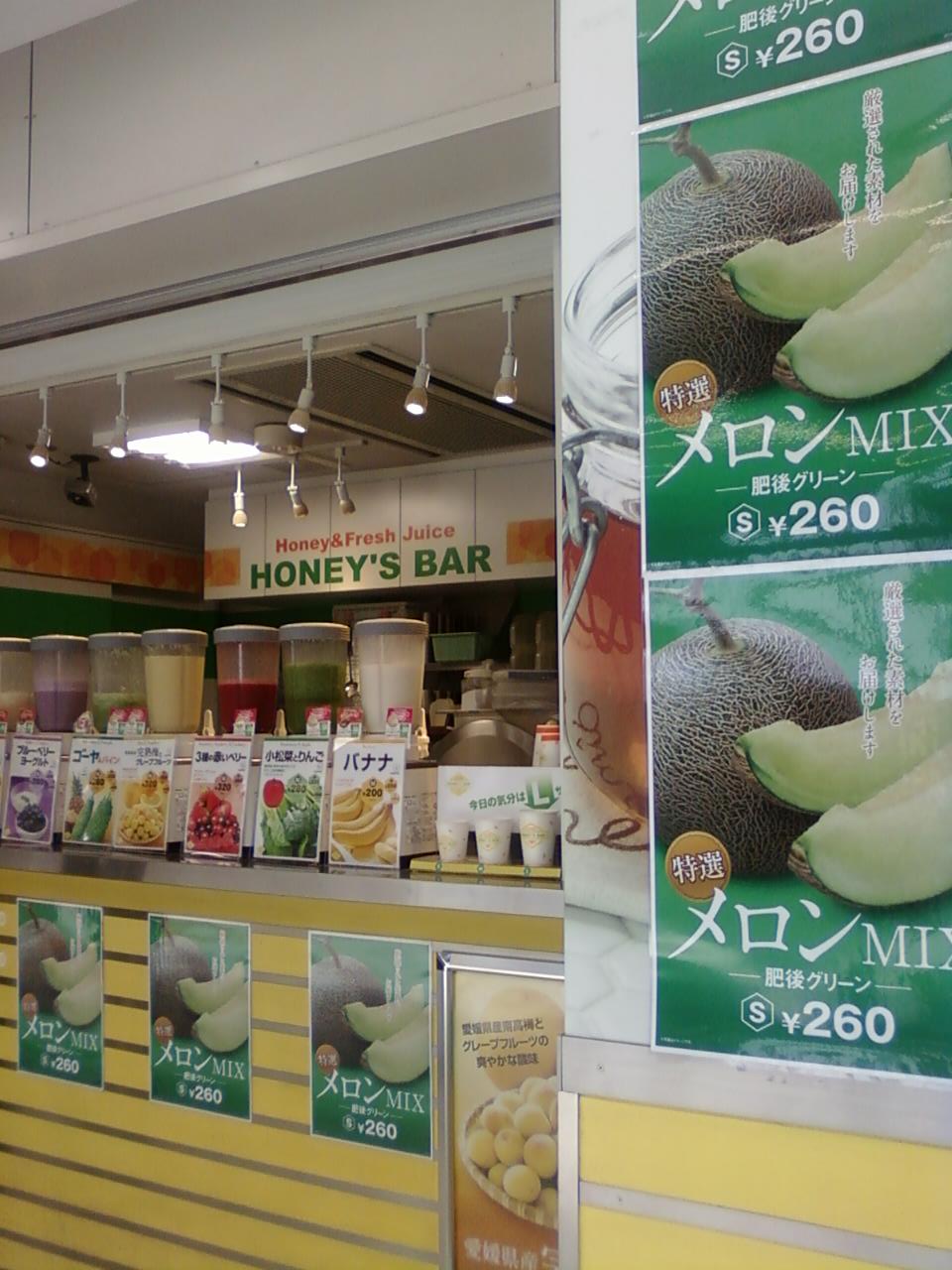 ハニーズバーはJR藤沢駅の改札を入ってすぐ右側にあるフルーツジュースのバーです。椅子やテーブルはありませんが、この改札内は結構広いので落ち着いて飲むことができます。肥後グリーンというメロンミックスのジュースをキャンペーンしていました。200円や300円台で気軽にビタミンがとれるのが良いですよね。