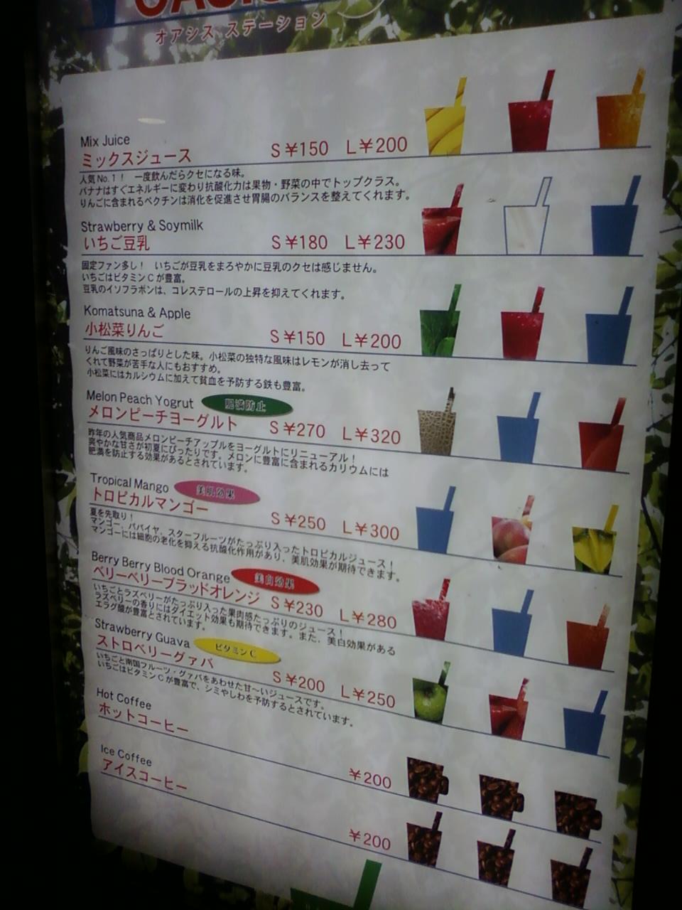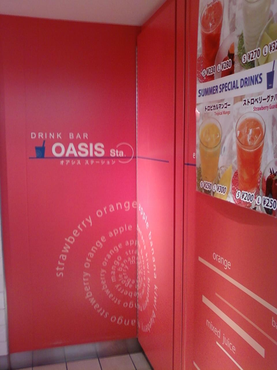 ここのオアシスステーションは小田急線新宿駅の地下、各駅列車の改札とホームの間くらい、小田急線の地下トイレの近くです。オレンジ色の店構えが目立ちます。フレッシュな果物のジュースが、200円台から飲むことができます。種類も豊富で、コーヒーもおいています。ちゃんとビタミンを補給したい方にはお勧めです。