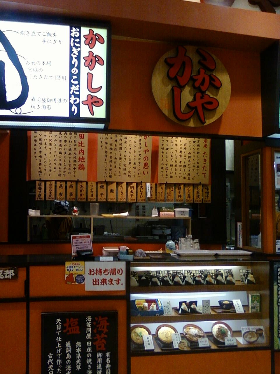 かかしやさんは、小田急小田原線および相鉄線海老名駅から五分くらいのとこにあるビナウォーク三番館のフードコート内にあります。中庭側から入って奥にあります。お米、海苔、お塩にいたるまで、厳選されたものを使っているという説明がたくさん書いてあります。全部読むのにはかなり時間がかかりそうです。ただ、ちょっと前書きが多すぎで近寄りがたい感があるかな?持ち帰り用のおむすびとして、ここにお店があるのは便利だと思いますが。