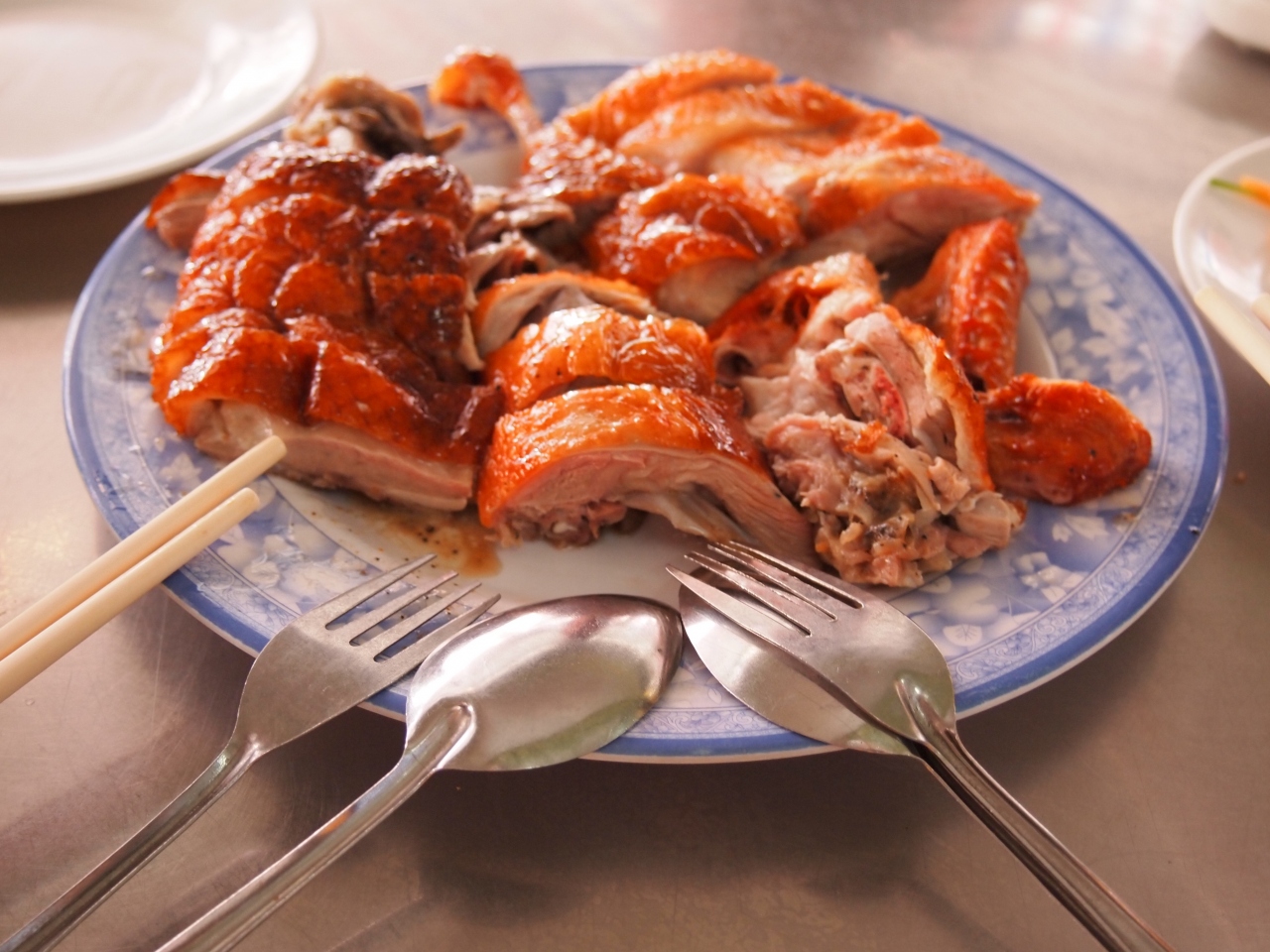 お客さんは白人、地元の人、沢山います。手が汚れるので、パックのお絞りがついてます。待ってる間に、テーブルの上のゴミを豪快に下に落として、さっと掃くおばちゃん。