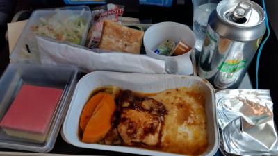 食事は離陸してから1回(エコノミーはチキンのみ、ビジネスは選べるようでした)、途中でパンかおにぎりの軽食、着陸前に軽いサラダが出ました。
