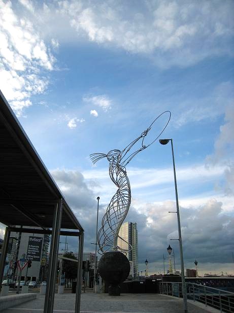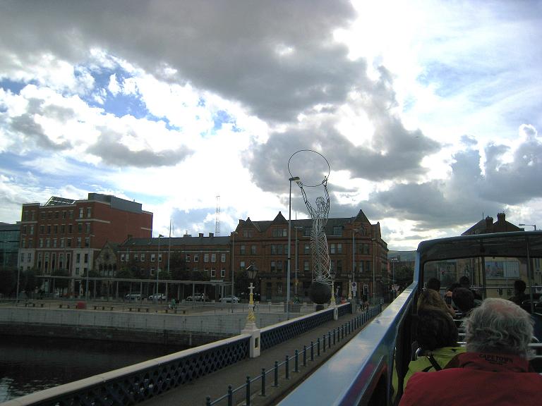 オープントップバスでのベルファスト市内観光の時、目にした針金のような物で作られた女性の像が気になりバスを降りてから、その像のたつ広場へ行きました。広場といってもそれほど広くはありませんが。よく見ると地球儀の模型の上に像が立っていました。