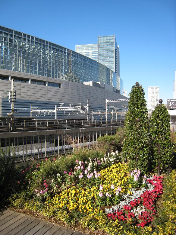 北海道等のアンテナショップ、本屋に旅行用グッズを売るお店や献血ルーム、地下にある飲食店は知っていたのですが、最近になって3階に花壇やベンチのある憩いのスペースを発見しました。その名も「有楽町コリーヌ(木のテラス)」。目の前で新幹線の通る姿を見ることができます。