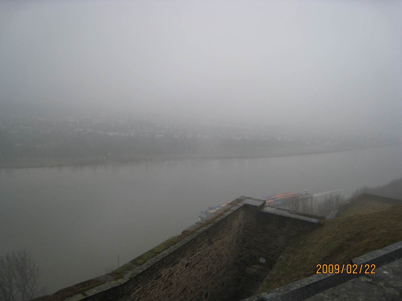 窓側の席からは、ライン川とモーゼル川の合流点(ドイチェス・エック)を眺めることができます。もう少し天候がよければよかったのになぁ。- 旅行時期