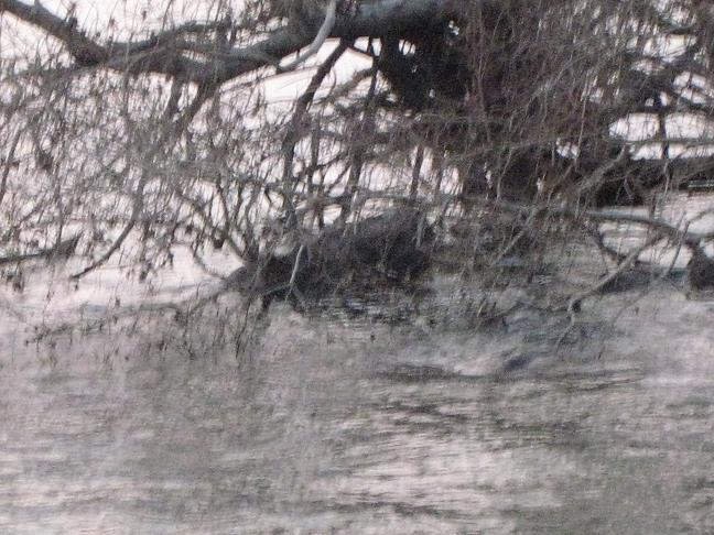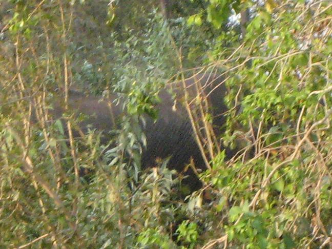 川辺にいるゾウは木に隠れて見えたり見えなかったり…。