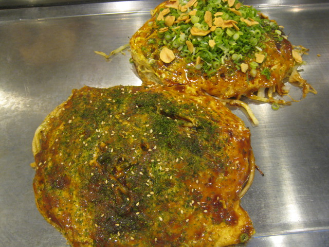 カウンター席の前の鉄板で若いお姉さんが焼いてくれる、きゃべつがたくさん入ったお好み焼き、ボリューム満点でした。かきとほたてのバター焼きも美味!