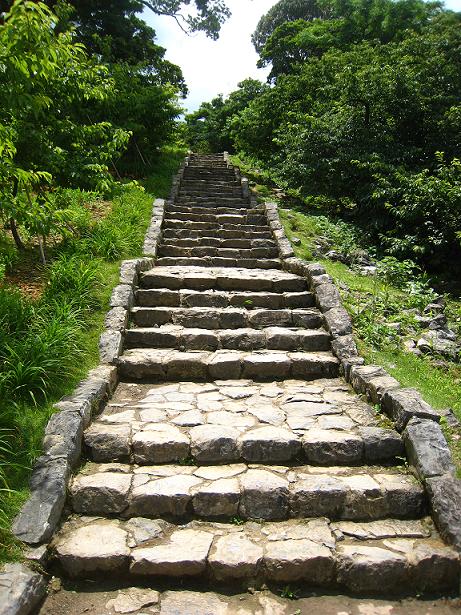 今帰仁城の正門、平郎門をくぐると、そこからまっすぐ七五三形式の階段が続きます。ガイドさんの話によると、この形式は歩くときに疲れにくそうです。