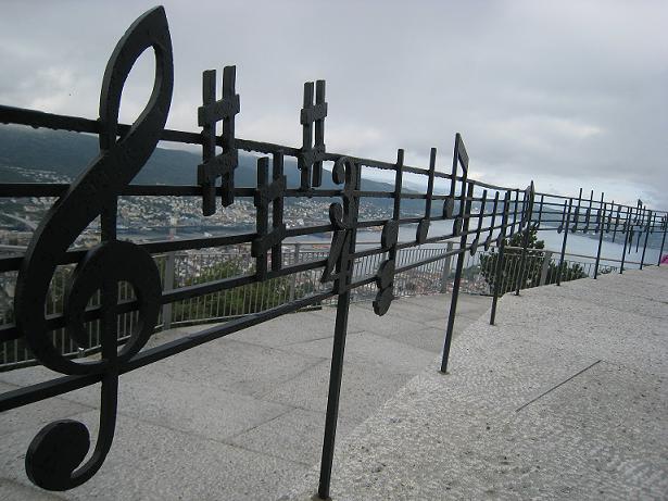 フロイエン山にケーブルカーで登り、歩いていると手すりのような所に、ト音記号や♯、♪等のオブジェがありました。手すりなのかそれ自体がオブジェなのか、よくわかりませんが、4分の3拍子の曲の楽譜のようです。何の曲なのでしょう??
