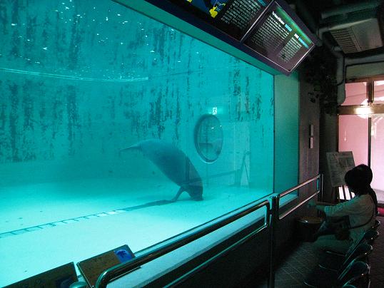マナティー館の地下へ下りると、水槽の前に椅子があり座ってマナティーが見られます。