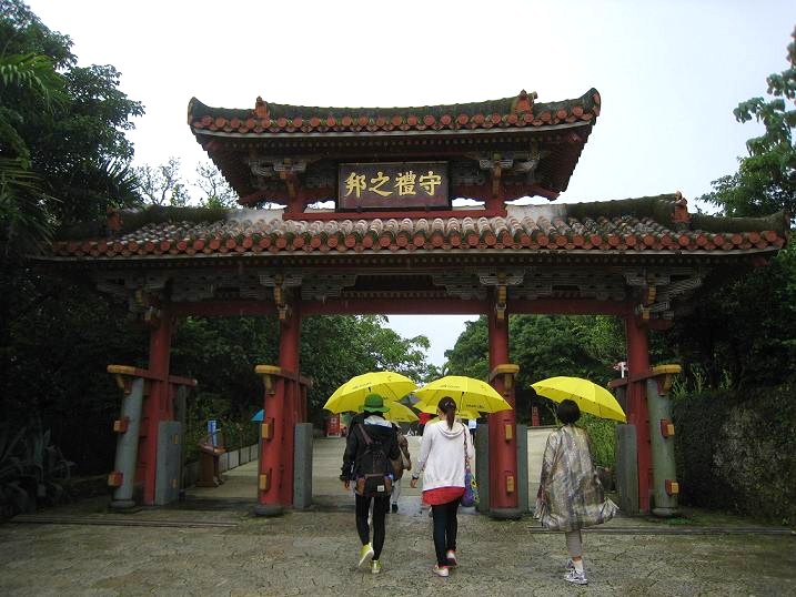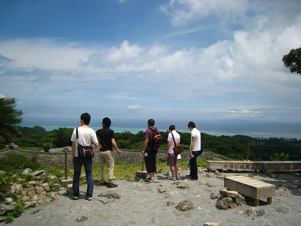 今帰仁城(なきじんじょう)は、グスク時代と呼ばれる13世紀から17世紀初頭頃まで、城や役所として利用されていました。石階段を上り、城跡へ向かいます。頑丈な石垣に囲まれ、敵から守られていたことがわかります。上から眺めると、青い海が見えました。