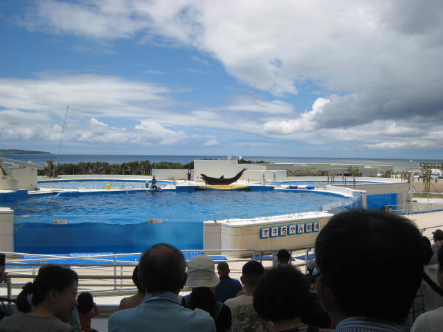 美ら海水族館や、ウミガメやマナティのいる水槽を見て、昼食をとった後でオキちゃん劇場へ。観客席はたくさんあります。沖縄音楽が聞こえてくると同時にイルカショーが始まります。完成度は高く、イルカがジャンプしたり、芸をしたりと楽しめます。