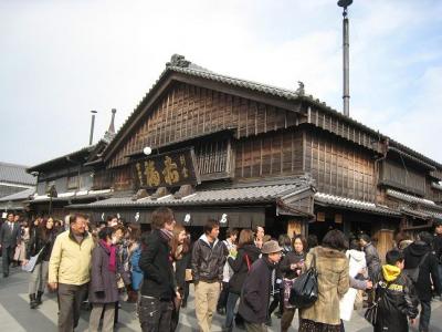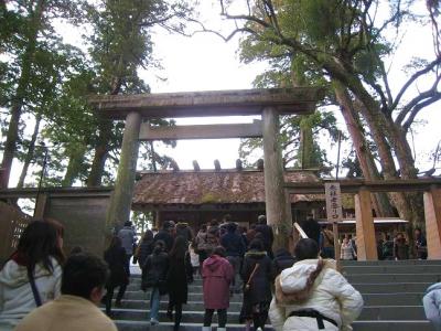 外宮近くから乗ったバスを降り、歩いているとおはらい横丁の通りをずっと歩いていました。内宮はどこか最初わからなかったのですが・・・宇治橋鳥居が見えてきました。2009年11月3日に「宇治橋渡始式」が行われ、20年ぶりに新しい橋が架け替えられたそうです。