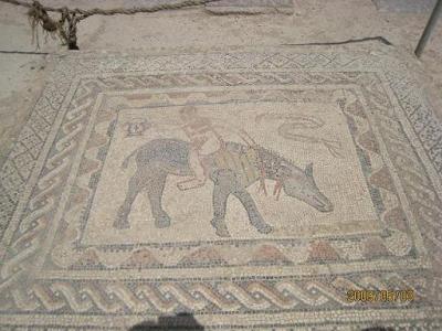 モザイク画の前にはロープがつけてあるだけで、中に立ち入れそうな場所がたくさんあり保存状態が気になりました。色あせたりしないだろうか…。- 旅行時期