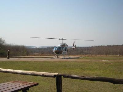 ホテル前からワゴン車に乗り、ヘリコプター乗り場へ。ここからビクトリアの滝の水しぶきが見え、期待が高まります。