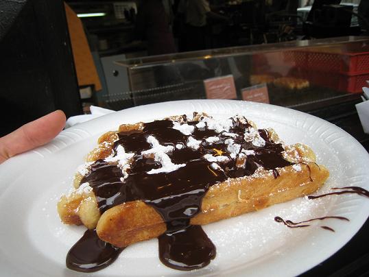 小便小僧のいる場所へ向かう途中にありました。店先では出来立てのワッフルを売っていて私たちはテイクアウトしました。紙皿にワッフルをのっけてくれ、お店の脇で立ち食いをしました。ガラス張りの所からワッフルを焼く様子等が見られました。