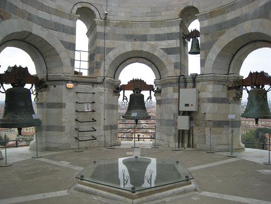 斜塔の一番上から階段を2つほど下りた場所に、鐘が5つくらいだったと思いますが吊るされていて、時間になると鐘のすぐそばでリズムのような音色が聴けます。ピサの斜塔に上った者の特権です!- 旅行時期