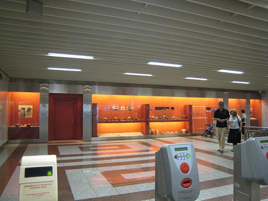 地下鉄、赤い線のAKROPOlI(アクロポリ)駅の改札口前に壺やお皿などの出土品が展示されていました。ホーム両側の壁にも彫刻のレリーフが飾られていて、説明書きによるとパルテノン神殿の柱上のレリーフのようでした。