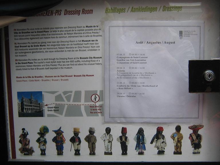 市立博物館には、小便小僧の衣装が展示されている部屋があります。部屋に入る前に、最近プレゼントされたであろうアメリカの国旗をモチーフにしたような衣装を着た小便小僧がいました。衣裳部屋にはガラスケースには収まりきらない衣装を、引き出しの中を開けて見るものもありました。