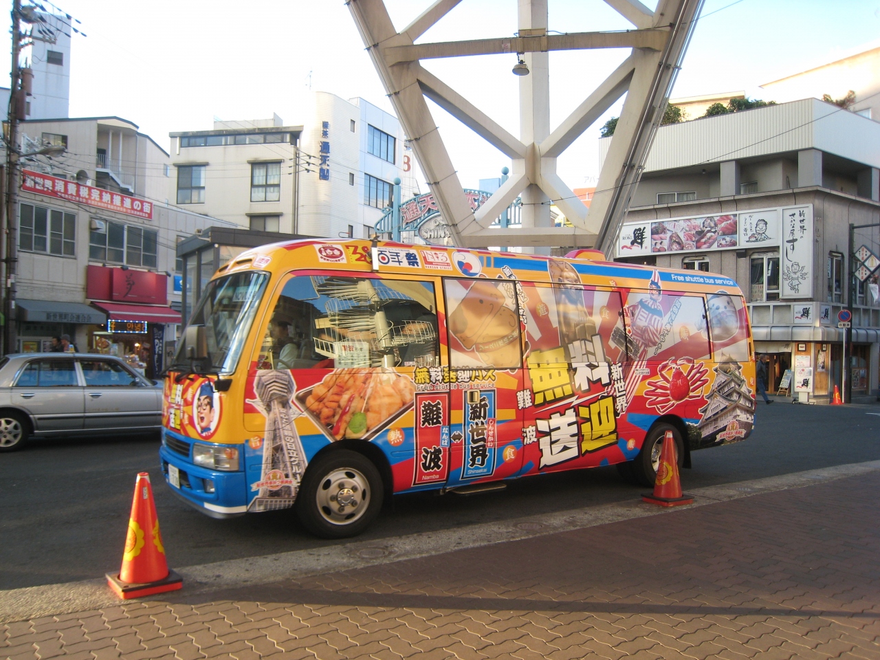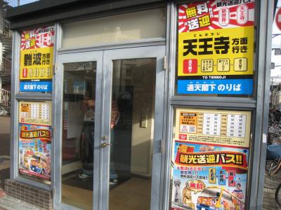 大阪城から通天閣まで地下鉄を乗り継ぎ、間違えながらたどり着いたので、帰りのルートをどうしようか考えていたのですが、通天閣の麓から30分毎に無料バスが出ていたのです。これに乗り、難波へ行くことができました。