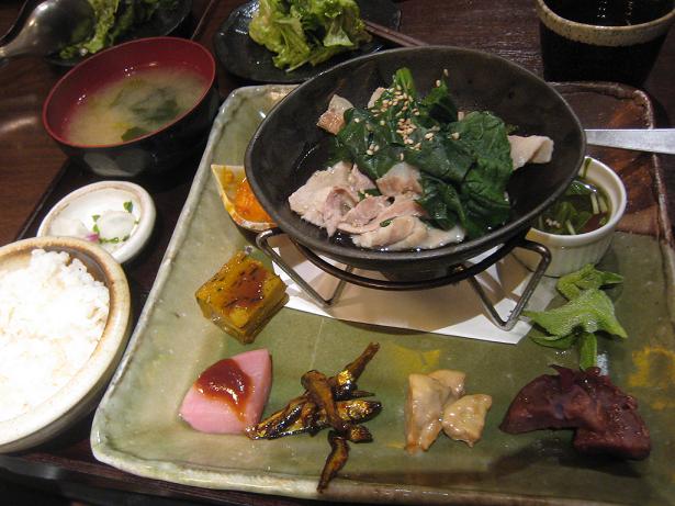 ヌー茶屋町の地下に、滋賀県で採れた食材を使った料理が楽しめるお店があります。11時半頃に行ったのですが、行列ができていました。40分ほど並び店内へ。まず始めにサラダがでてきます。サラダやごはんのお代わりは自由でした。おかずの種類も豊富でバランスのとれた食事ができます。