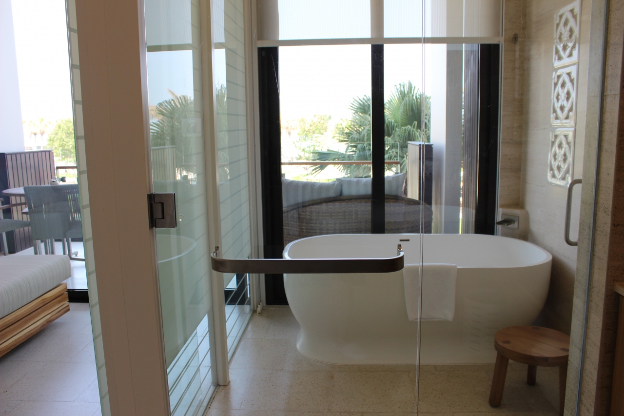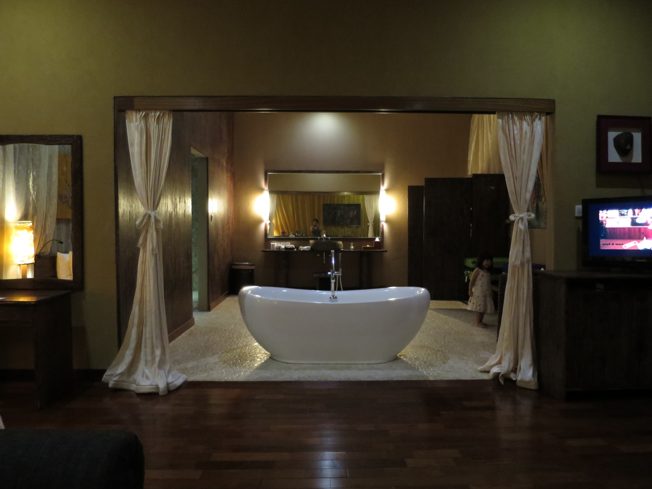 - お部屋によるのでしょうが、バスルームがベッドルームと同じくらい広いお部屋でした。お湯圧は低め。バスタブに水をためるのに時間がかかった