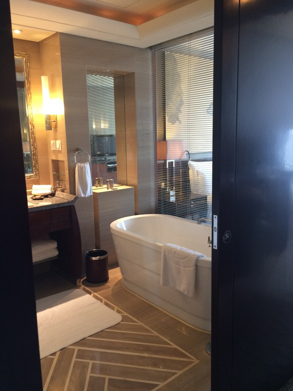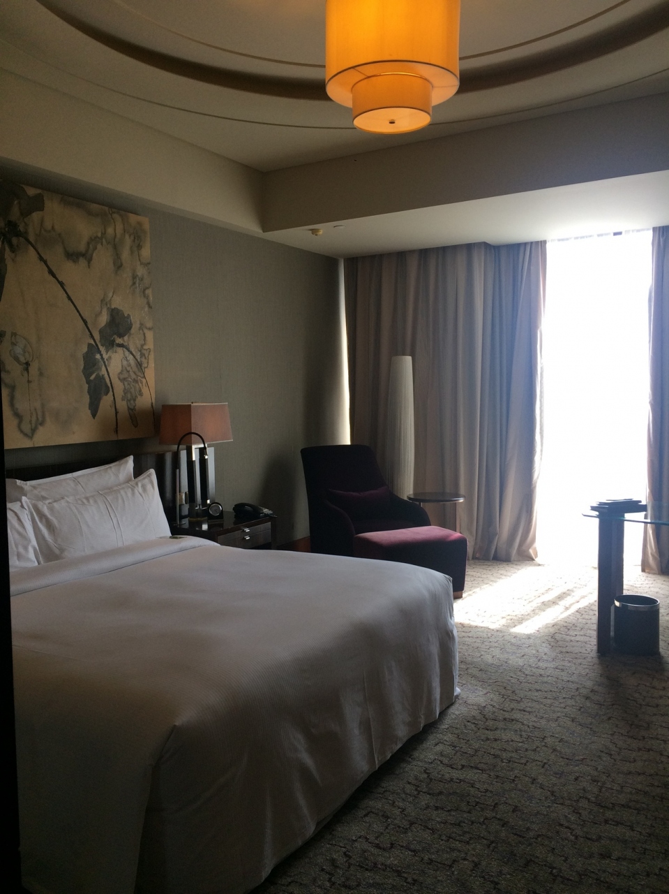シングルユースなので狭いお部屋かなと思いきや、キングサイズのベッドにオットマン付のゆったりした椅子、スーツケース3つは広げられそうな広々とした部屋に、バスタブ付の清潔なバスルーム。バスローブとスリッパ付で優雅な気分で過ごせました。さすがマリオットです。