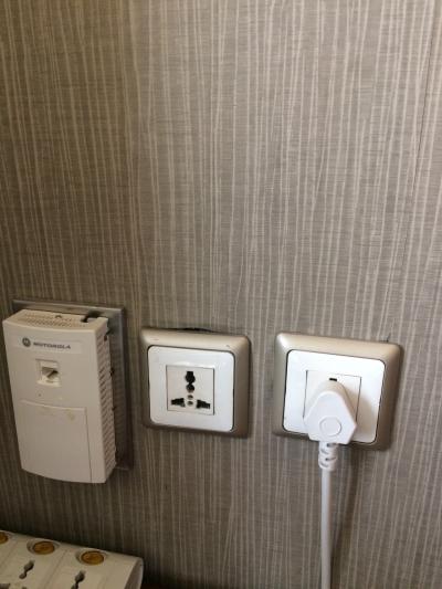 無料で毎日2本のミネラルウォーターが補充されます。冷蔵庫、湯沸し用のポット、バスローブ、使い捨てスリッパ、セイフティボックス、アイロン、アイロン台、ドライヤー、傘、DVDデッキ、マルチタイプの電源が5、6個がデフォルトでセットされていました。