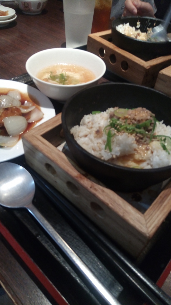酢豚、石焼きチャーハン、スープ、小篭包が付いたセットで、お腹いっぱいになりました。- 旅行時期