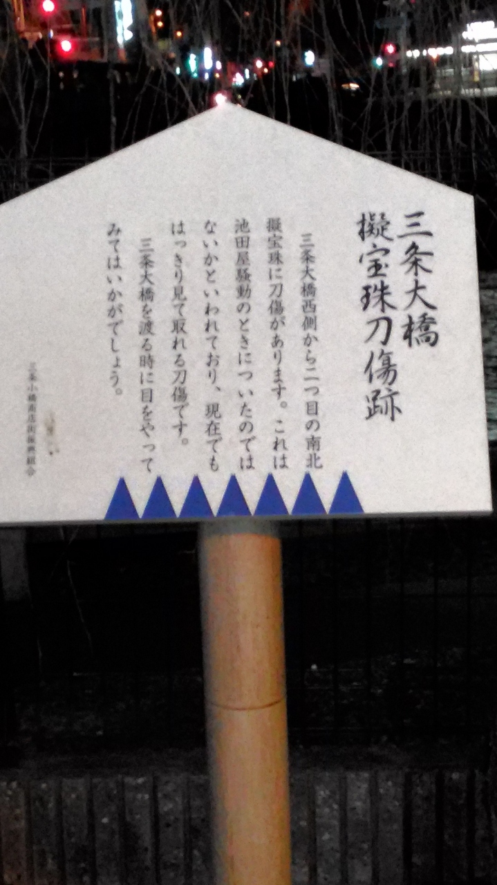 この立て札が無ければ気づくことができなかったと思います。池田屋騒動の刀傷とはどんなものだろうと橋を渡りながら探しましたが、夜間だったこともあり見つけられず残念でした。