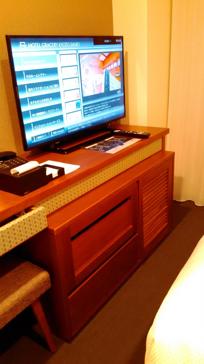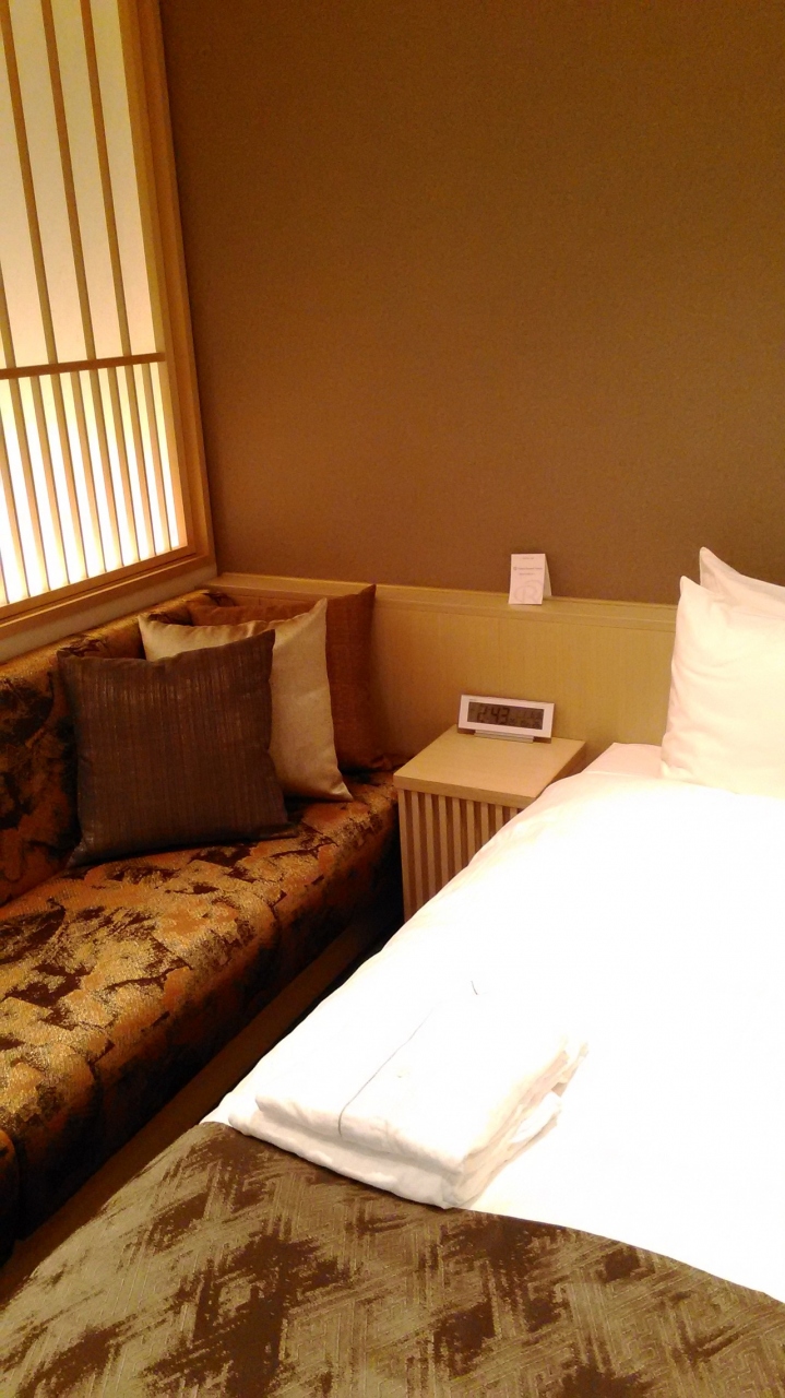 京都駅から近いことと新しいホテルなので選びました。チェックインの対応は男性スタッフでとても丁寧でした。部屋はツインでしたが、どこも清潔で気持ちがいいです。「キモノマインド」とうたっているだけあって、着物地を使ったインテリアで和の雰囲気があります。