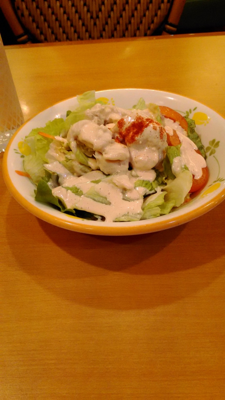 ランチセットお得なのもありますが、サラダをたっぷり食べたかったので、やわらかチキンのサラダを注文してみました。タイトル通りしっとりした柔らかなチキンが、レタスの上にのっています。単品で注文したパスタとサラダで、ボリューム満点。チキンサラダは299円です。