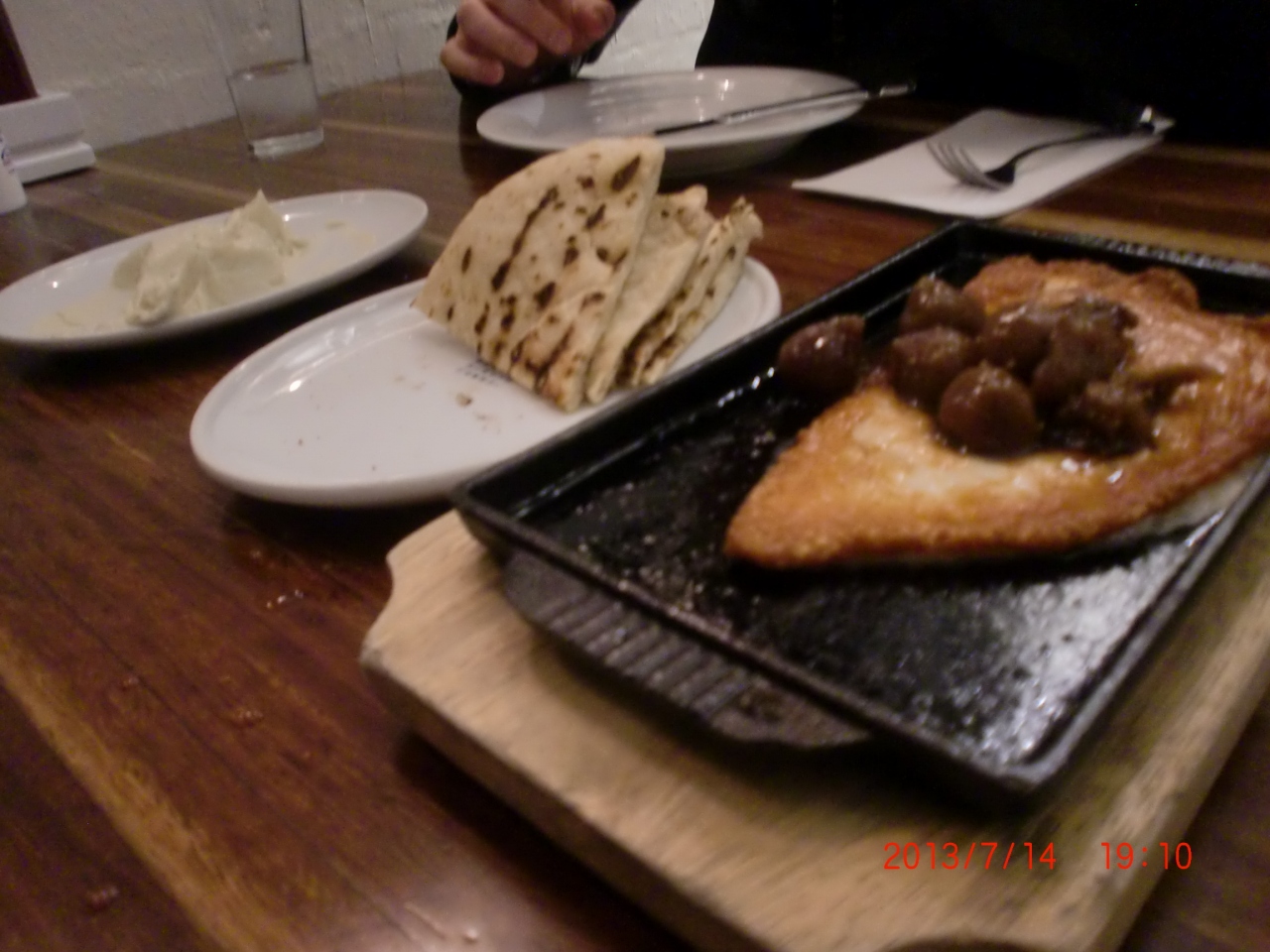 ピタパン・ラムのグリル・イカのグリル・チーズを焼いていちぢくを添えたもの・マッシュポテトのミートグラタンを3人でシェアしました。どれも本当に美味しくて、一番最初に出てきたピタは、炭火で香ばしく焼いてあり、クリーム状のソースをたっぷりつけていただきます。カラマリグリルは柔らかくて、イカの味がとっても美味しい。チーズのグリルは塩気の強いチーズといちぢくを同時に食せば丁度良く美味しい!1品づつはそれほど大盛りでないように思いましたが、3人ではお腹いっぱいで完食できず、少し残してしまいました。ギリシャ料理のデザートも楽しみにしていましたが、残念ながらデザートまでいきつけず。個室でしたが、サービスの方が頻繁に目を配ってくれて、気持ちの良いサービスをしてくれました。上記の料理と3人それぞれ飲み物を注文して130ドルぐらいでした。個室だったので満足度も高かったと思いますが、味は大満足でした。- 旅行時期