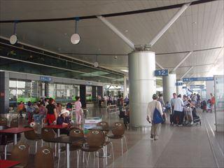 市内からタクシーで約30分朝夕は込み合うので余裕を持って空港へ行くのがいいです。空港は意外とこぎれいですっきりした感じ。喫煙は出発ロビーから外に出て右端にあります。免税店でタバコを購入しました。日本の免税店より少し安かったです。