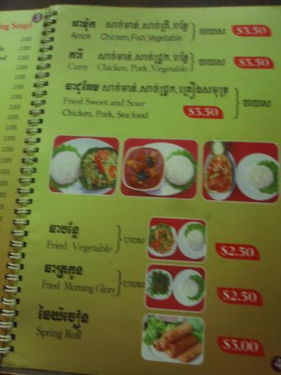 夜19時過ぎに入店すると店内は地元の人はおらず欧米のお客さんが何組かいました。17時から19時まではハッピーアワーでビールが0.5ドルで飲むこと出来ます。残念ながら時間が過ぎていたので1ドルのビールで乾杯。フィッシュアモック8ドルそしてクメールチキンケバブ パパイヤピクルス添え4.5ドルどれもやさしい味付けで辛くなくおいしい。店内の雰囲気がいいのでのんびりと食事ができて良かったです。