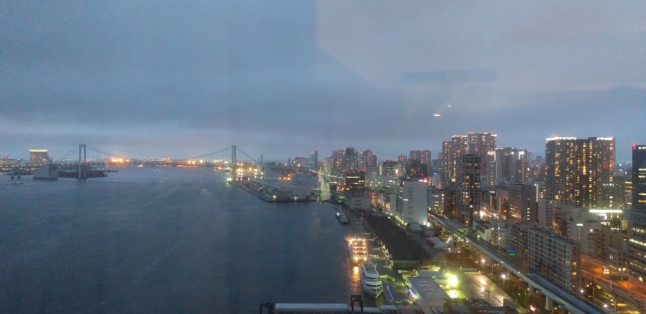 夜景になったレインボーブリッジは雨に煙って潤んで見えましたが、気分転換になりました。晴れてたらまた違う景色だったかもしれませんが。