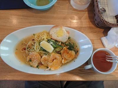 近くのキッサコーヒーさんで買い物した際、おいしいパスタやさんを聞いて伺うことにしました。15時までランチタイムで、エビジェノとボンゴレレモンのパスタをチョイス。ランチはサラダとトマトベースのスープもついて、1500円前後。