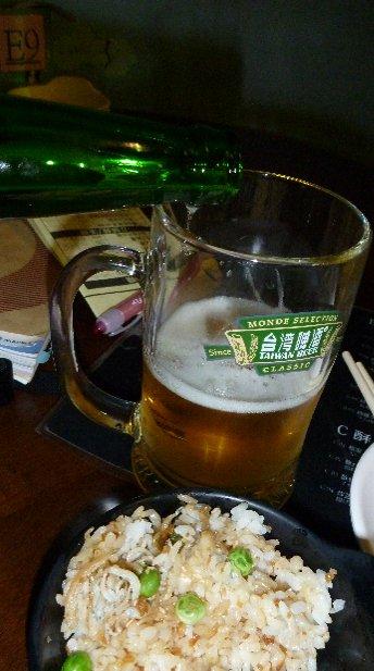 日曜日であったからか、ものすごく混んでいたが相席のようなところで2人の若い台湾人と同席に。台湾ビールを頼んだら、どうやら種類が2種類あるようで、金牌(ジンパイ)の瓶ビールをチョイスした。