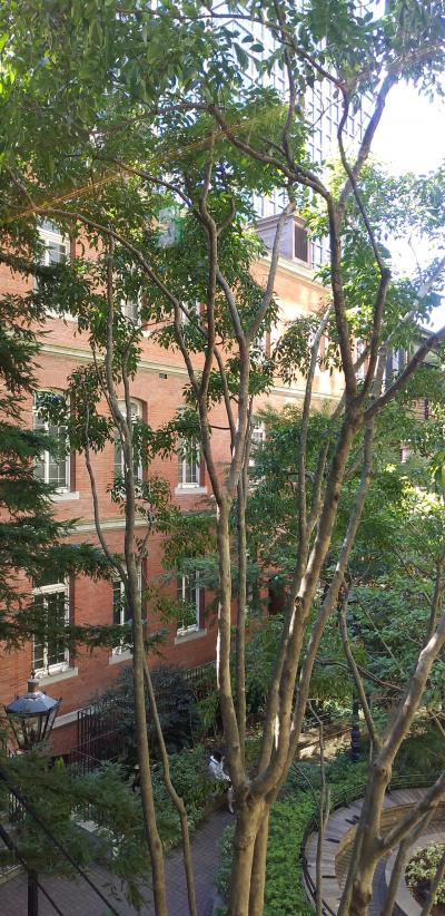 樹木を部分的にあしらった広い空間で、空も広い。ソラノホテルもこの敷地内にあります。