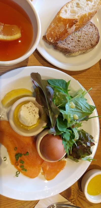 セットメニューと単品の飲み物をお願いしました。量は控えめですが、バランス良く朝からいただくには理想的なものでした。ストロベリーラテが春の限定でありました。時間をたっぷり使ってのんびりいただく場所です。九時近くには、パンをメインのテラス席はかなり空いていました。- 旅行時期