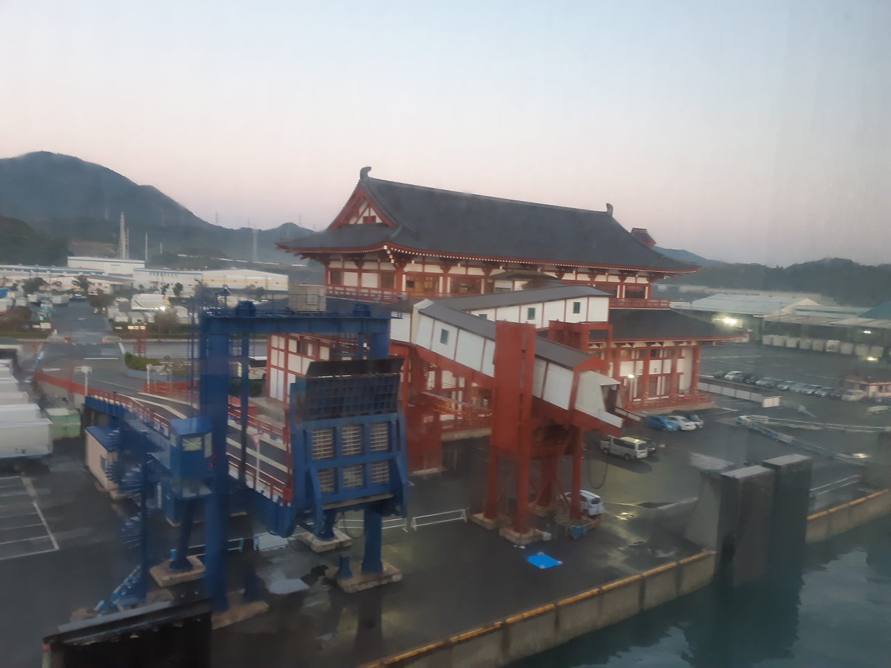 神戸から阪九フェリーに乗船し、新門司港に到着しました。ここからJR門司駅経由でJR小倉駅まで、無料の送迎バスが出ています。朝7時に船が到着して下船すると、ターミナルのすぐ前にバスが待っていてくれました。路線バスとかタクシーはあまりなく交通の便が悪い場所のようで、遅れないように注意しましょう。行った時はバス2台いました。7時15分頃に発車して、JR門司駅までは25分位はかかった気がします。予想より駅から離れていたようです。