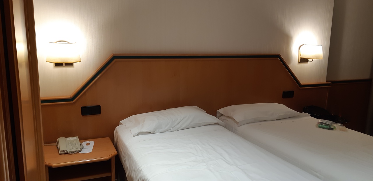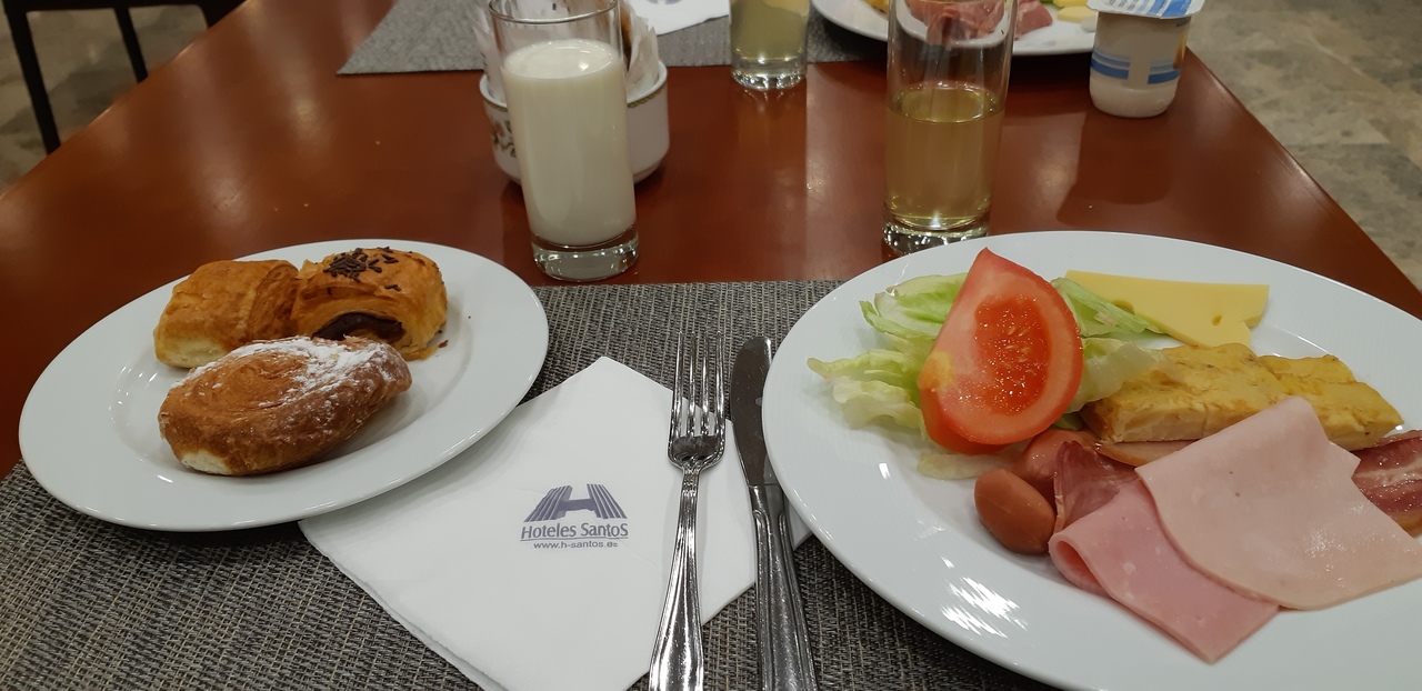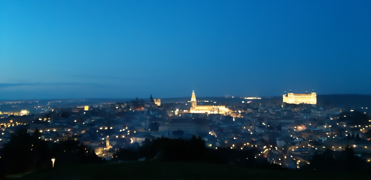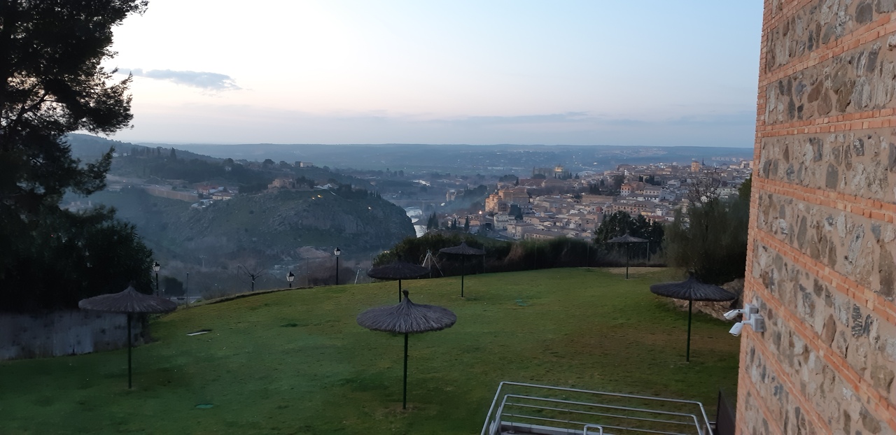 ツアーで利用しました。到着したとき、ちょうど日が沈む頃でとても素敵でした。残念ながらプールビューの部屋でしたが、フロント横のカフェのテラスから夕景、夜景を眺めることができました。朝早くは、カフェが閉まっていて朝の風景はカメラに納められなかったけれど、レストランから霧立ち込めるトレドの街が眺められ、満足。食事も美味しく、シャンプー、リンスあり、スリッパ、歯ブラシはありません。建物がとても素敵ですよ。