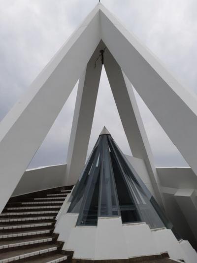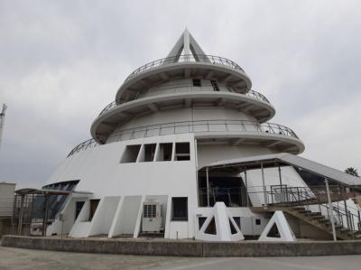 三角駅の目の前の海沿いに建っている『海のピラミッド』は、島原行きのフェリーターミナルとして建設されたようです。今はそのフェリーが運航しなくなって、訪ねる人もあまりないようです。外観はまさに海のピラミッドですが、中に入ると巻貝のように、頂上までの螺旋階段があります。とてもデザイン性がありました。外階段も同じように螺旋状になっていて、面白い事に、所々に中に入れる、外に出れる構造になっていました。二人で外と内、どちらが早く登れるか競争(走らずに)して楽しかったです。この建物は外観もいいですが、中に入るともっと感じるものがあると思うので、ぜひ入るのをお勧めます。コンクリート打ちっぱなしで、冬は寒そうですが、ピアノも置いてあり自由に引ける感じでしたね。