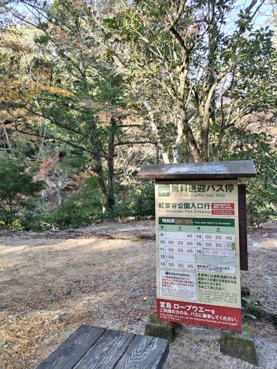 登りはホテル岩惣さんの前にバス停がありましたが、始発が9時50分で遅めで、あとは20分間隔です。お昼は便が少ないようです。最初は乗れば楽かなの思ったのですが、歩いても10分程で到着するし、公園の中の紅葉も楽しめました。無料なので高齢者や足の悪い方にはとても便利です。ところが行った日は紅葉の時期で、平日なのに観光客が多かったようで、運行停止になっていました。こんなこともあるのかと思いました。なのであまりあてにしないほうがいいかもです。