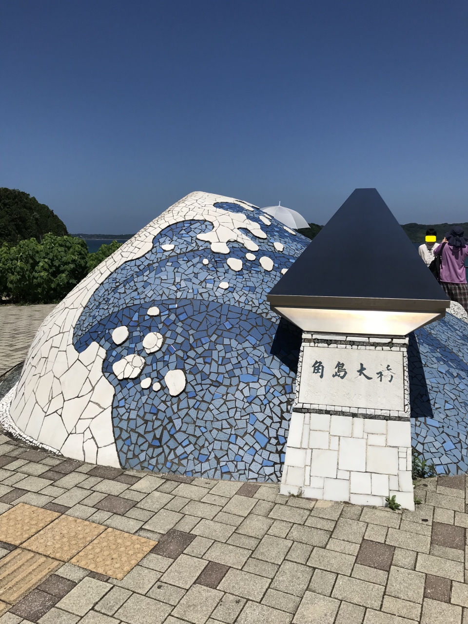 元乃隅神社はとても暑かったが、ここは心地よい風が吹いており、普段から風が良く通るのか、近くに風力発電の大きな風車が何基も設置されているのが見て取れた。