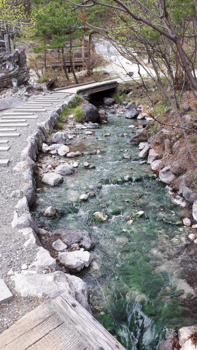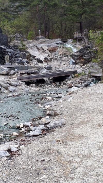 湯畑の奥の方へ歩いて、西の河原へ歩いて行きます。道の横を流れている川。...