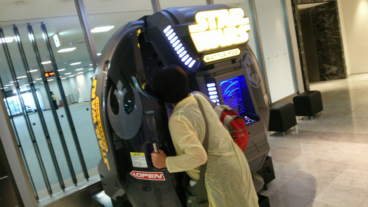 anaラウンジにスターウォーズのゲームがあります。ラウンジに入るときカウンターでコインをもらいすぐ横でカプセルに入ります。