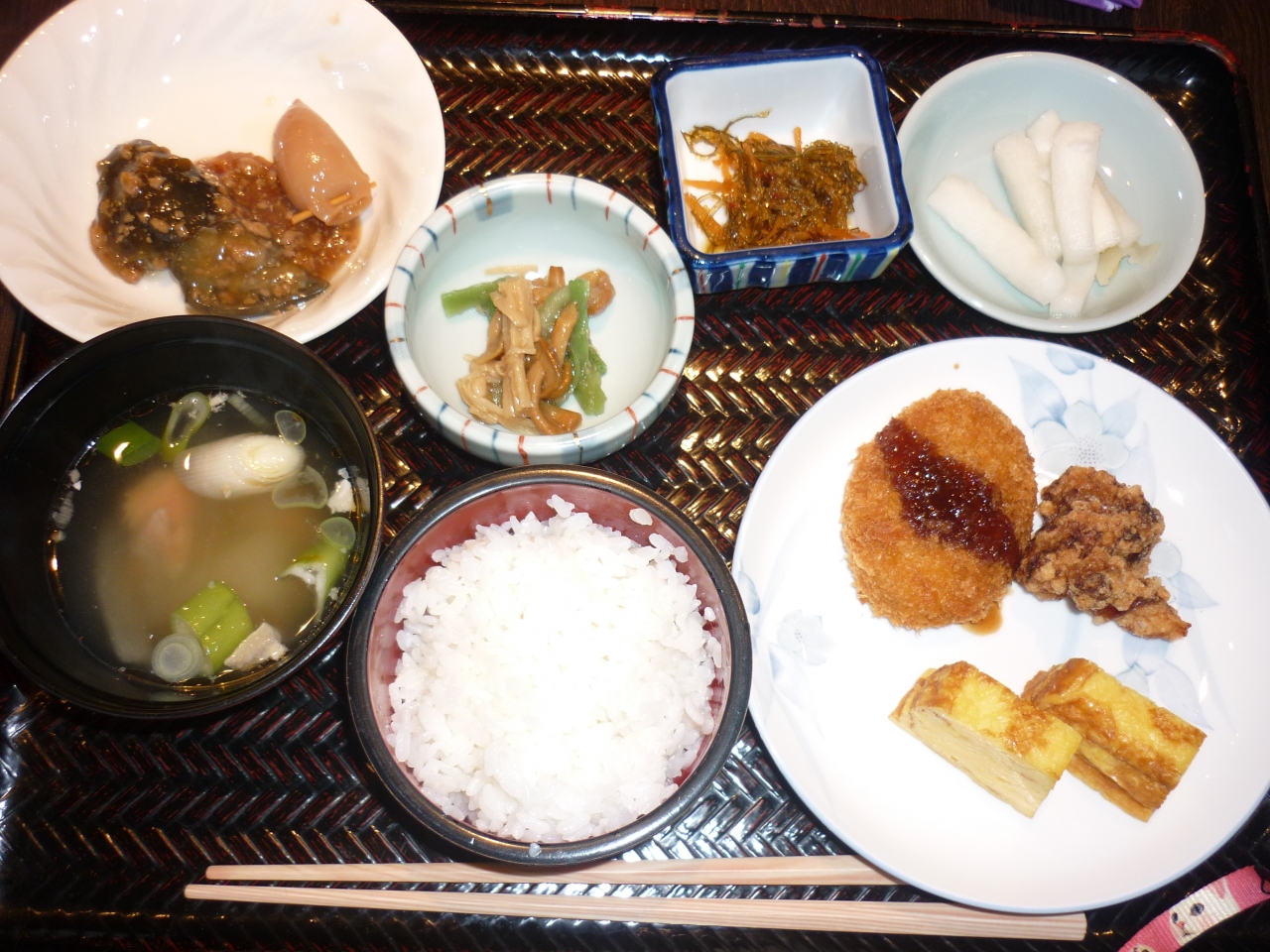 簡単な無料朝食サービス(焼き立てパン数種・コーヒー・ミルク・サラダ・おにぎりなど)あるし、1階にはコンビニもある。